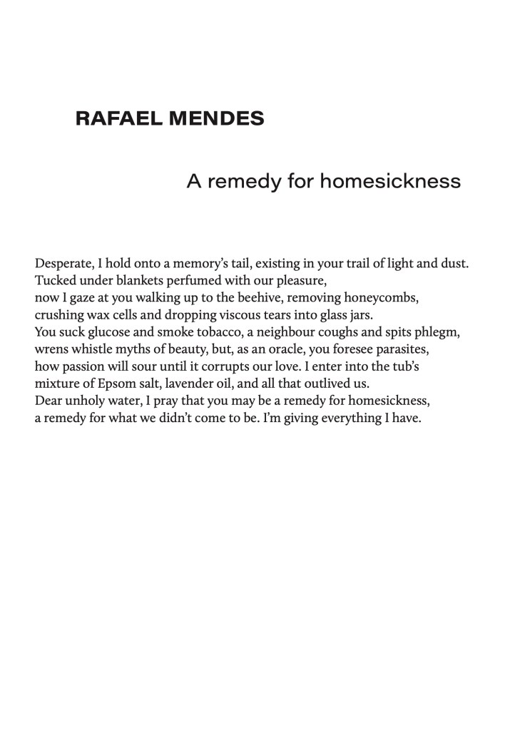 𝗥𝗮𝗳𝗮𝗲𝗹 𝗠𝗲𝗻𝗱𝗲𝘀 is a Brazilian-Irish migrant whose work has recently appeared or is upcoming in Poetry Ireland Review, Banshee, Wasafari, and gorse. His pamphlet 𝘛𝘩𝘦 𝘔𝘪𝘨𝘳𝘢𝘯𝘵 𝘋𝘪𝘤𝘵𝘪𝘰𝘯𝘢𝘳𝘺 was published this year by The Ireland Chair of Poetry and HOWL New Irish Writing.